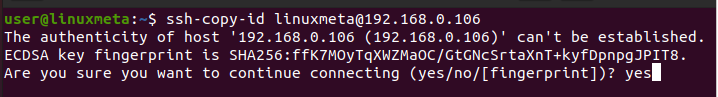 If it’s your first time connecting to the server via SSH, you will get an output prompting you to confirm that you want to proceed with the connection. Type ‘yes’ and continue.