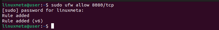 If using the ufw firewall tool, you can open port 8080 for TCP connections with the command below.
