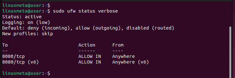 The output below shows that our port 8080 is open and can accept connections from anywhere.