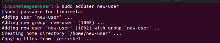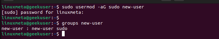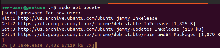 We’ve created ‘new-user’ for our case. You don’t need to include sudo if you are running as root. However, include it if you run a non-root account with sudo privileges.