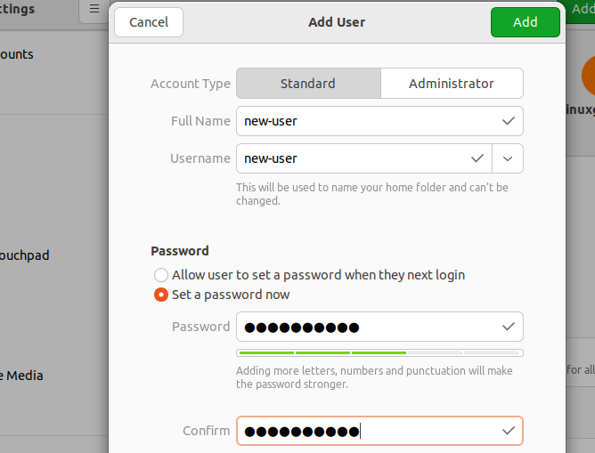 Next, add the details for the new user, such as their username and password. Under the Account Type, we are creating a standard user with basic privileges. If you want a user with root privileges, select the administrator option.