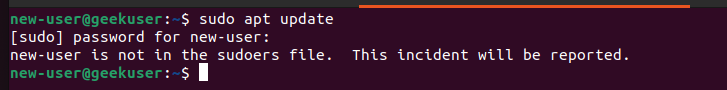 We will get an error even when we try running a simple update command that requires sudo. This error occurs because the new user does not have root privileges.