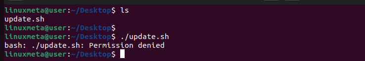 Assume you have the update.sh script below. To run it, simply use the ./script-name syntax, and your file will execute. However, you may get the permission denied error, as in the case below.