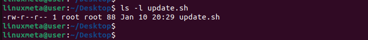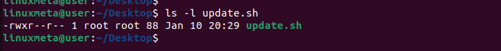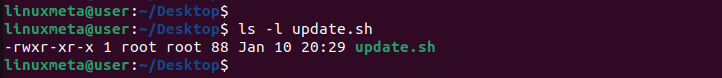 Rechecking the file permissions shows that our user now has the rwx permissions, allowing them to read, write, and execute the shell script.