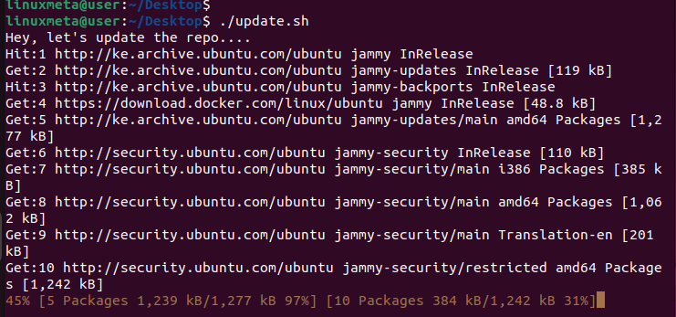 Having changed the file permissions for the shell script, we can now execute it and verify that we managed to fix the permission denied error. Run the script as shown below.